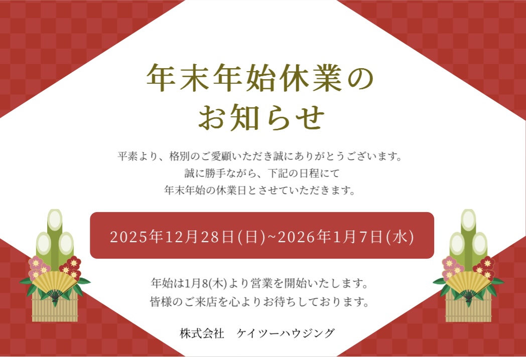 2025.12.23 ★年末年始休業のお知らせ★ ★年末年始休業のお知らせ★ 平素より、格別のご愛顧を賜り誠にありがとうございます。 誠に勝手ながら下記の期間を、年末年始休業とさせていただきます。 2025年12月28日(日)~2026年1月7日(水) 期間中にいただいたお問い合わせは1月8日(木)より 順次対応させていただきます。 ご不便をお掛け致しますが、何卒よろしくお願いいたします。 来年も変わらぬご愛顧のほど、よろしくお願い申し上げます。 株式会社ケイツーハウジング TEL:072-265-0001 カテゴリー: お知らせ お知らせ一覧に戻る